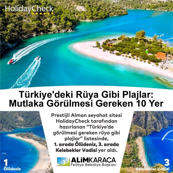 Bu defa da prestijli Alman seyahat sitesi HolidayCheck tarafından hazırlanan “Türkiye’de görülmesi gereken rüya gibi 10 plaj” listesinde Ölüdeniz ilk sırada, Kelebekler Vadisi ise 3. sırada yer aldı. Geçtiğimiz günlerde İngiltere merkezli CV Villas adlı turizm şirketi tarafından, dünya çapında 100’den fazla destinasyonun analiz edildiği araştırmada; Fethiye, 100 üzerinden 70,8 puan alarak “Yüzülebilir Denizler” kategorisinde zirveye yerleşmişti. Bu sonuçla Yunanistan, İspanya, İtalya, Fransa ve Hırvatistan gibi güçlü rakiplerini geride bırakan Fethiye; yıl boyunca elverişli ve konforlu yüzme koşullarıyla Akdeniz’in denizde yüzme için en iyi destinasyonu seçilmişti.