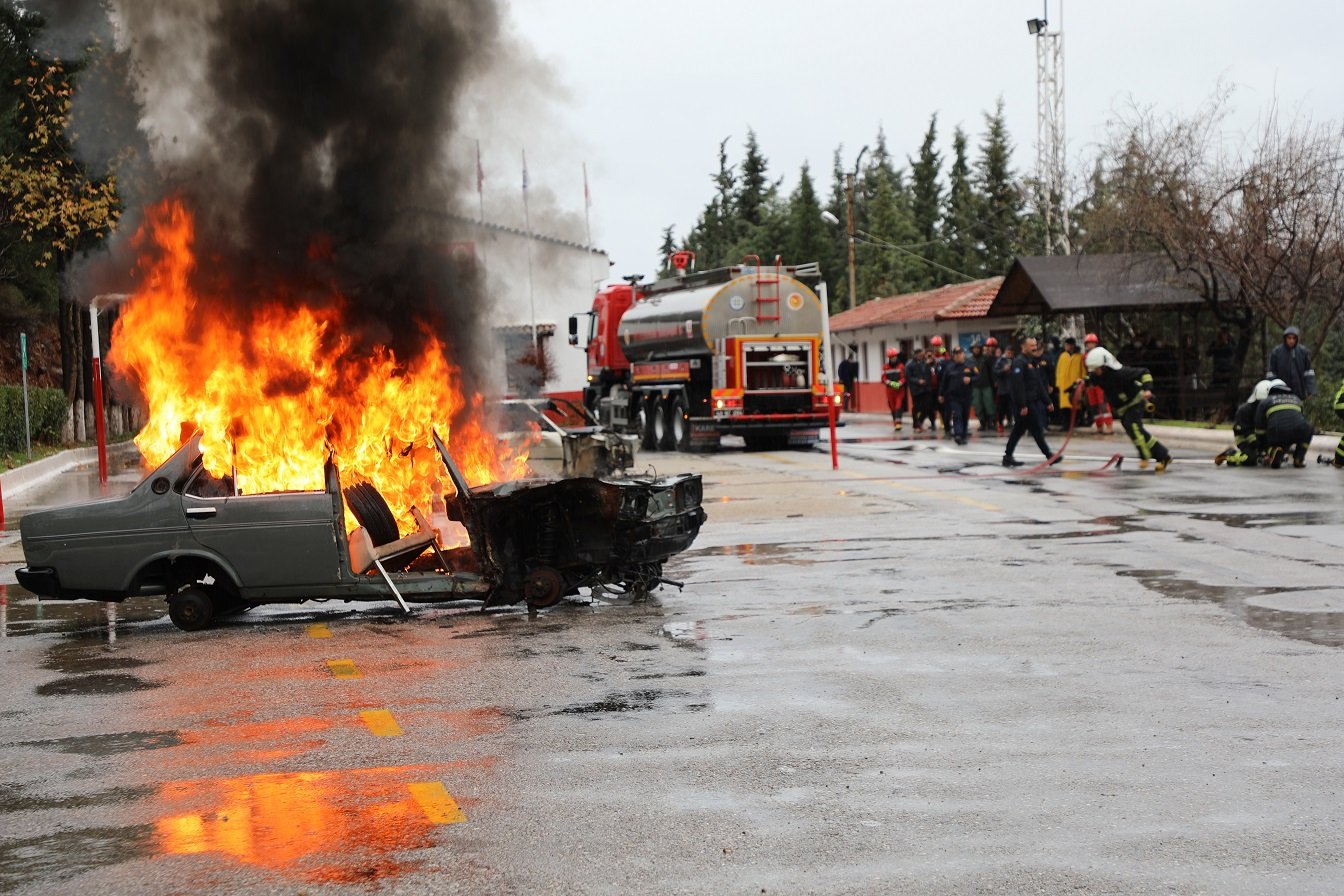 İlk ihbar olarak araç yangınına çıkış yapan yeni itfaiye erleri, olay yerine kısa sürede gelerek hızlı bir şekilde çevre güvenliğini sağlayarak yanan araca müdahale etti. Zamanla yarışan ekipler, kısa sürede yanan aracı söndürdü. Senaryo gereği sıkışmalı trafik kazası ihbarı alan ekipler, araç içinde mahsur kalan iki vatandaşı çıkarmak için yoğun mücadele verdiler.Kaza kırım aletleri ile sıkışan vatandaşları araçtan çıkaran ekipler, senaryo gereği yaralıları güvenli bölgeye taşıdılar.
