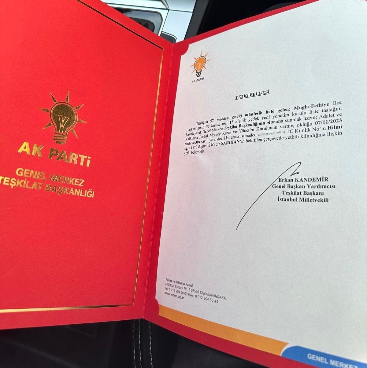 AK Parti Fethiye İlçe Başkanlığı görevine atanan Kadir Sarıhan, bugün gerçekleştirilecek tören ile koltuğu devralacak.