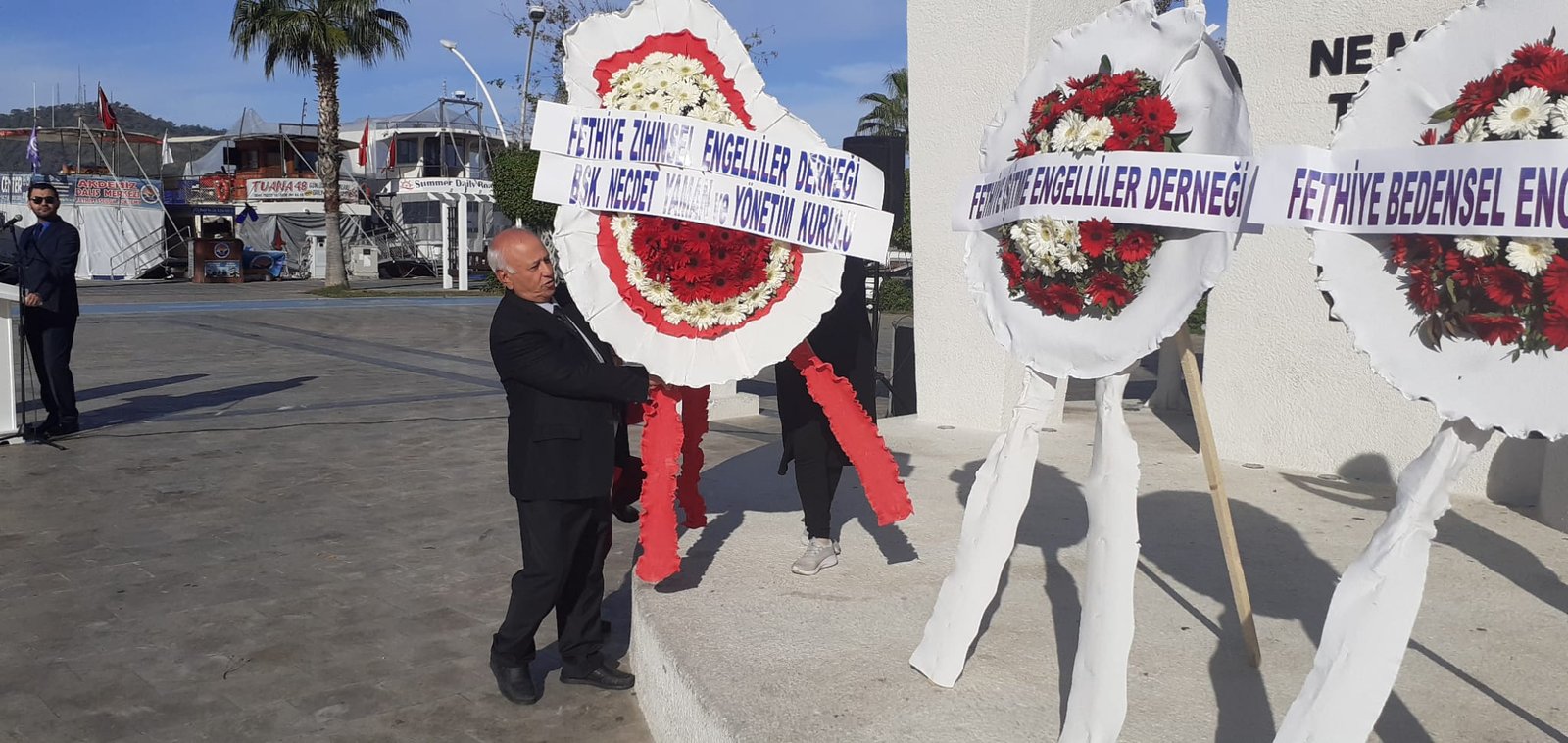 3 Aralık Dünya Engelliler Günü kapsamında ilk olarak Beşkaza Meydanı Atatürk Anıtı önünde çelenk sunma töreni gerçekleştirildi. Düzenlenen programa Fethiye Belediye Başkan Yardımcısı Oğuz Bolelli, Fethiye İlçe Emniyet Müdürü Kayhan Dadaşoğlu, siyasi parti temsilcileri, dernek ve oda başkanları ile vatandaşlar katıldı.