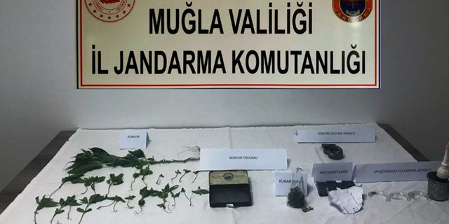 Bodrum ilçe jandarma KOM Takip Timi ve uyuşturucu madde arama köpeği ile birlikte Kızılağaç ve Çiftlik mahallesinde iki ayrı adrese operasyon gerçekleştirildi. Kızılağaç Mahallesinde ikamet eden H.E. ve Çiftlik Mahallesinde ikamet eden B.S. isimli şahıslara ait iki ayrı adreste yapılan aramada; 35 kök kenevir bitkisi, 17 gram kubar esrar, 15 gram kenevir tohumu, 10 gram metamfetamin, 2 adet uyuşturucu kullanma aparatı ve esrar öğütme aparatı ele geçirdi.