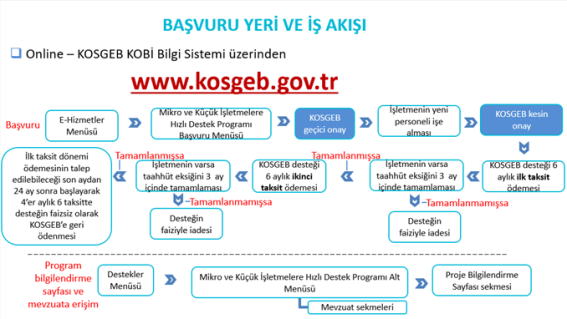 Asgari prosedürle, süratli ve güvenli bir yöntemle destek verilmesi gerektiğinden, diğer KOSGEB destek programlarından farklı olarak kurul veya komite değerlendirme prosedürü olmayacaktır. Uygunluk kriterlerini karşılayan MKİ’ler, KOSGEB’in web tabanlı destek uygulama arayüzü olan KBS (E-devlet sistemi, Gelir İdaresi Başkanlığı, SGK, MERSİS – ESBİS ve diğer bazı veritabanlarıyla bağlantılı olan KOBİ Bilgi Sistemi) üzerinden başvuru yapabilecektir. Bütçe imkanları ölçüsünde başvuru sırasına göre geçici onay verilecek, yeni personeli istihdam eden MKİ’lerin ödeme talebi başvuru sırasına göre bütçenin yeterli olduğu sayıdaki işletmenin kesin onayı verilecektir.