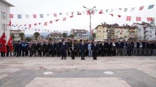 İlk olarak Şehitler Anıtı önünde çelenk sunma töreni gerçekleştirildi. Organize edilen etkinliğe Fethiye Kaymakamı Fatih Akkaya, Garnizon Komutanı Dalaman Dz. Hv. Üs Komutanı Dz. Alb. Okan Mumcu, Fethiye Belediye Başkanı Alim Karaca, daire amirleri, siyasi parti ilçe başkanları, sivil toplum kuruluşları temsilcileri, öğrenciler ve vatandaşlar katıldı. Anıta çelenklerin sunulmasının ardından Fethiye Belediye Bandosu eşliğinde saygı duruşunda bulunulup, İstiklal Marşımız söylendi.