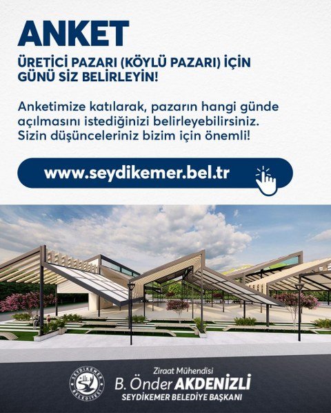 Seydikemer Belediyesi hem çevrimiçi hem de yüz yüze gerçekleştirilecek anketlerle, vatandaşların hangi günlerde üretici pazarına gitmek istediklerini öğrenmeye çalışıyor. Bu anketle, pazarın açılacağı günün, halkın yoğun talep gösterdiği bir zaman dilimine denk getirilmesi planlanıyor. Anket, Seydikemer Belediyesi'nin resmi web sitesi ve sosyal medya hesapları üzerinden online olarak erişilebilecek. Vatandaşların, bu ankete katılarak üretici pazarının kurulacağı gün hakkında söz sahibi olmaları bekleniyor. Ankete katılmak isteyenlerin www.seydikemer.bel.tr adresini ziyaret edebileceği bildirildi.