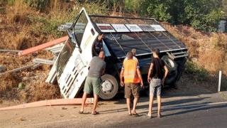 Muğla'nın Milas ilçesinde meydana gelen trafik kazasında sürücüsünün direksiyon hakimiyetini kaybettiği kamyon şarampole devrildi.
