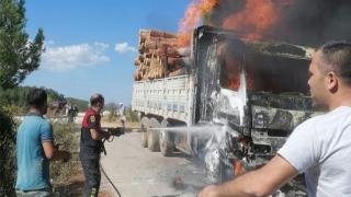 Tomruk yüklü kamyon yandı